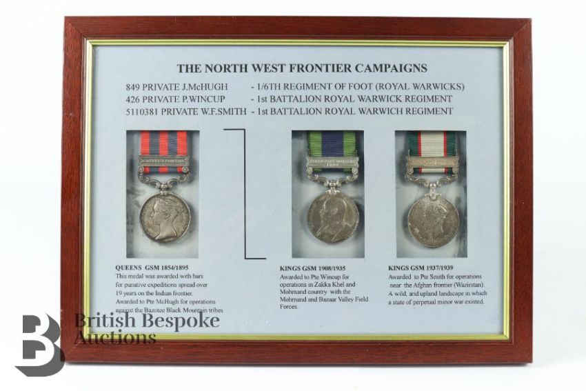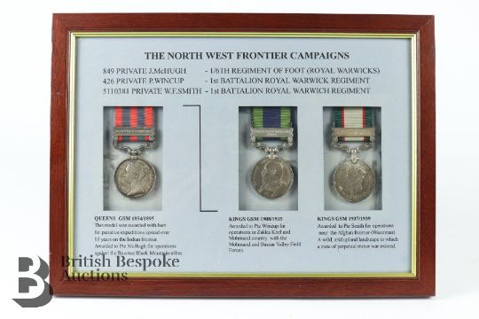 A framed trio of medals: North West Frontier Campaigns to 849 Private J. McHugh 1/6th Regiment of Foot Royal Warwickshire Bazotee Black Mountain Tribes; 426 Private P. Wincup 1st Battalion Royal Warwick Regiment Zakka Khel and Mohmand Country and 5110381 Private W.F Smith 1st Battalion Royal Warwick Regiment Wazirstan, framed. Note: Medals were collected by the late Tom McDonald, volunteer Chairman of the Layup Committee, and later Trustee of the Royal Regiment of Fusiliers (Royal Warwicks) Museum St, Johns House, Warwick (1997-2011)