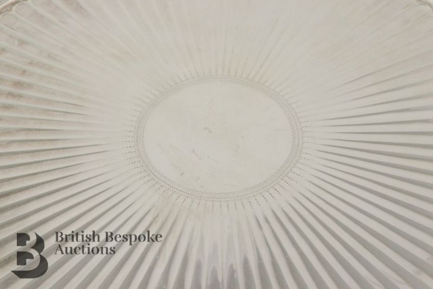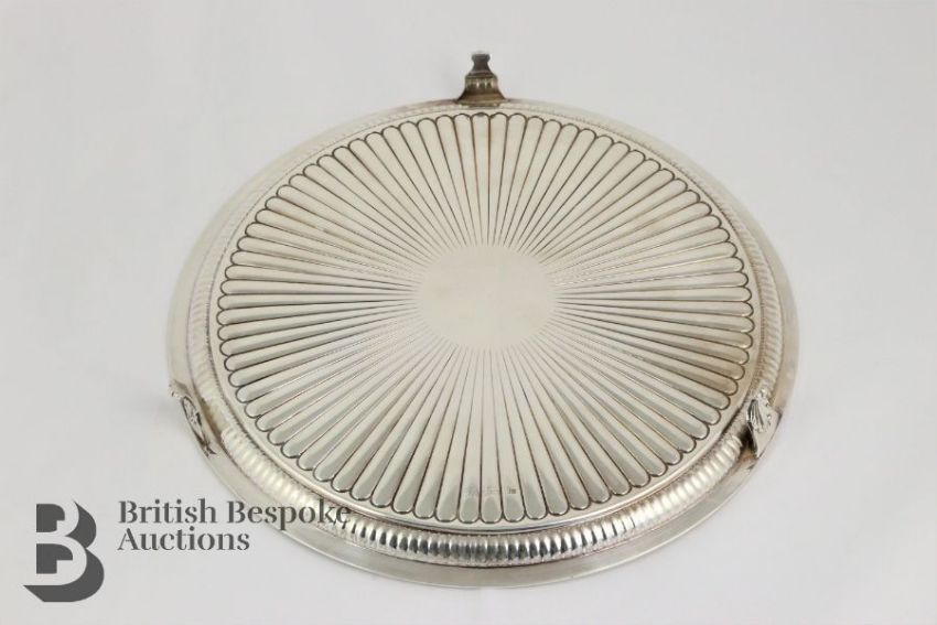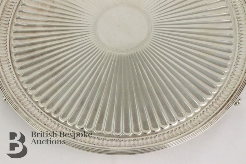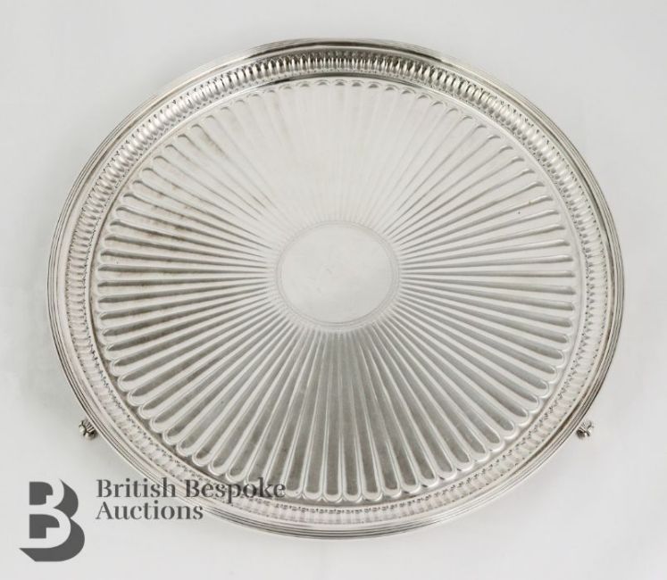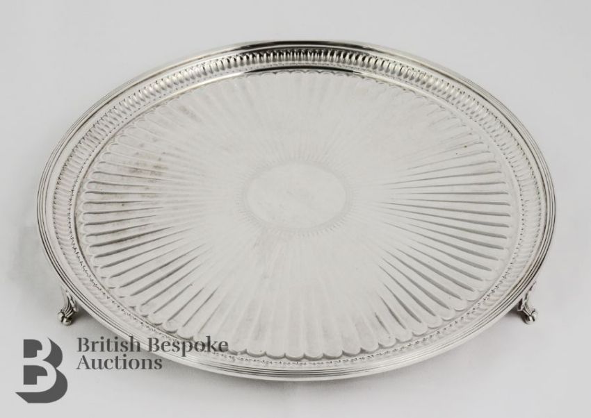 Victorian silver circular salver, London hallmark, dated 1881, mm Edward Hutton, approx 34.5 cms diameter, supported on three claw feet, approx 1015 gms.