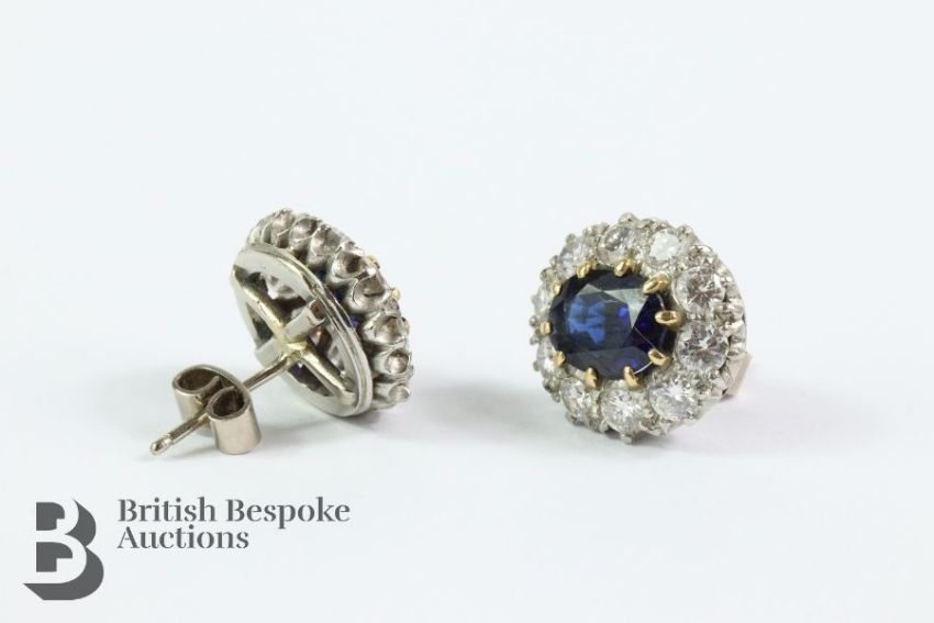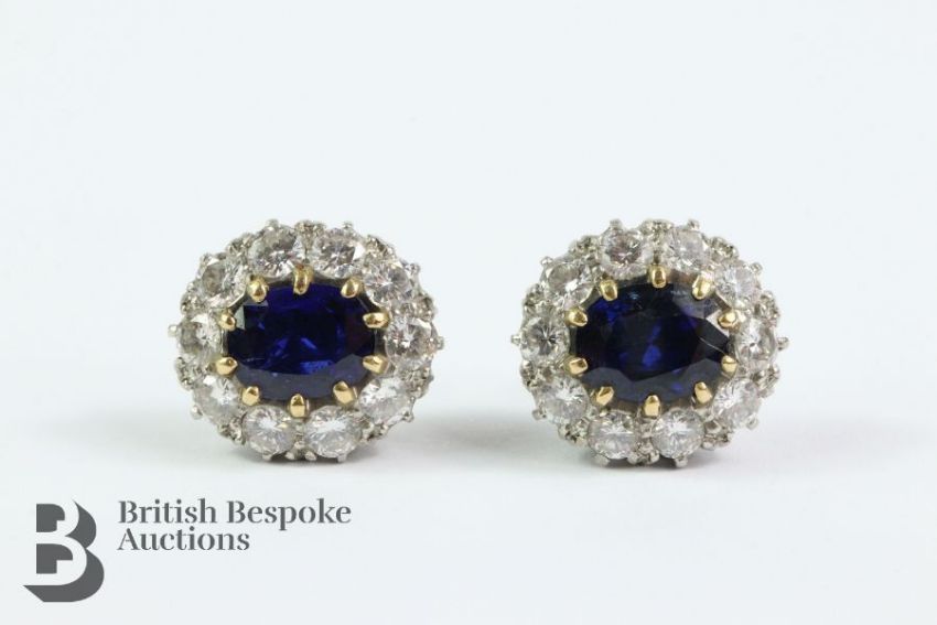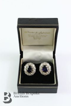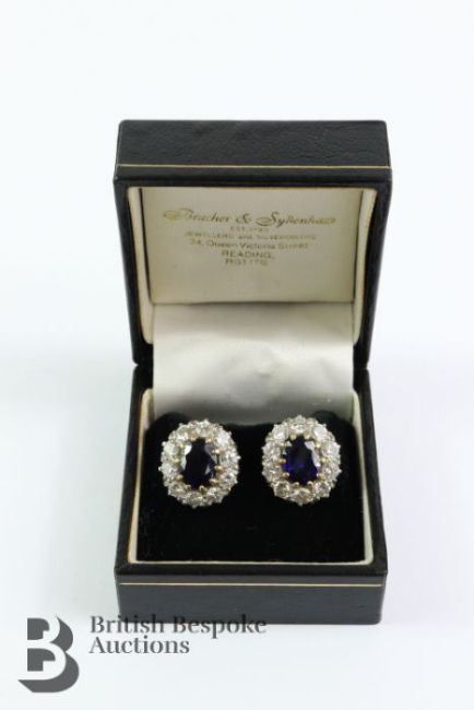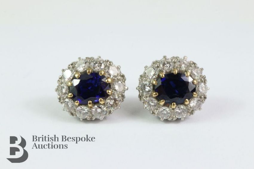 Pair of 18ct white gold sapphire and diamond earrings. The earring set with midnight-blue oval sapphires 8.7 x 6.7 mm, surrounded by 2.4 cts of dias, approx 9.49 gms.