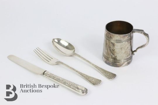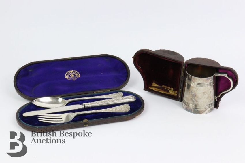 Victorian silver christening set, comprising spoon, fork and knife, London hallmark dated 1874, mm Francis Higgins, approx 153.3 gms in the original box mm. S.H & D Cass, together with a silver-plated christening cup, unmarked, housed in the original maroon box. (2)