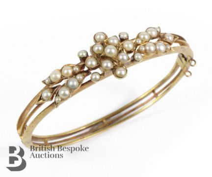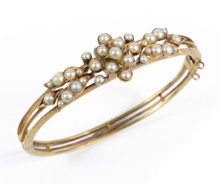 Edwardian 14/15ct gold pearl bangle. The bangle measures 55 mm. The bangle set with a seed pearl floral arrangement approx 17.46 gms.