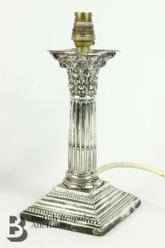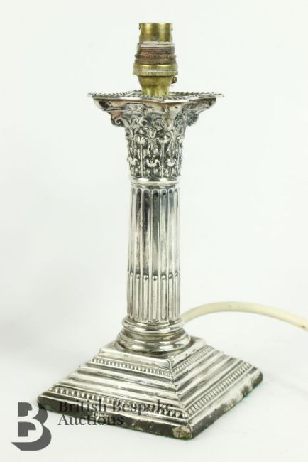 Pair of silver candlesticks, Corinthian in style, converted to lights, Sheffield hallmark, dated 1872, mm WL Bros, weighted, approx 884 gms.