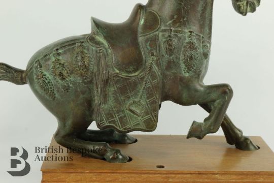 Chinese bronze figure of a horse, seated on it's haunches, approx 46 x 30 cms, supported on a fitted stand.