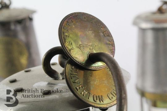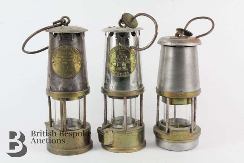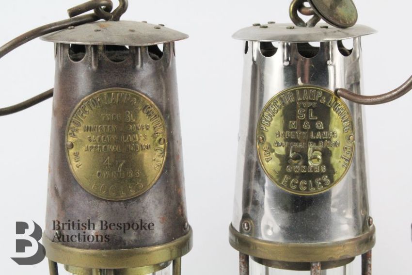 Three vintage miner's lamps, including two Eccles Type SL Protector Lamp & Lighting Co and a Wolf Safety Lamp Co (William Maurice Ltd Sheffield).