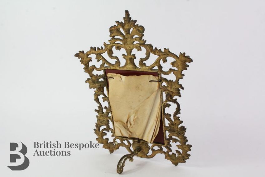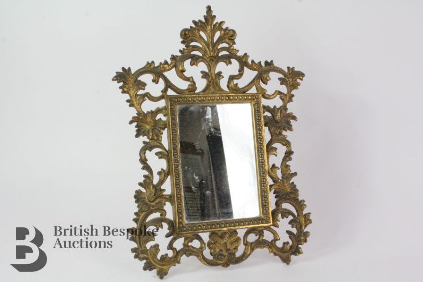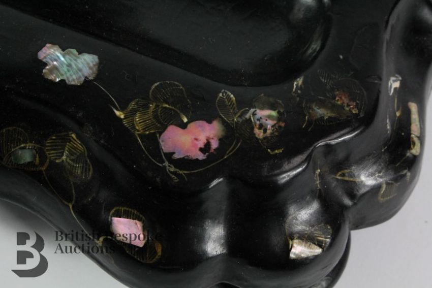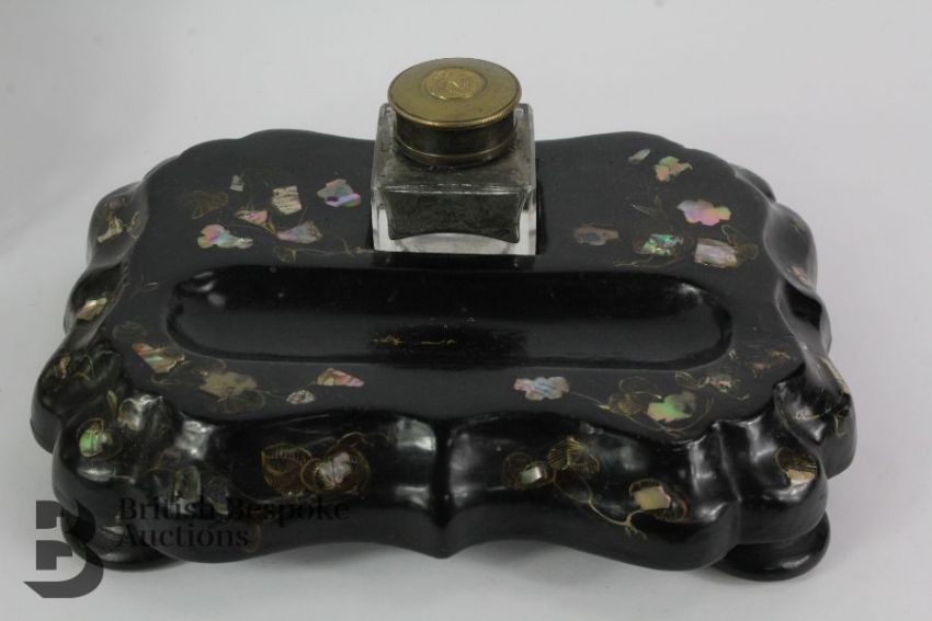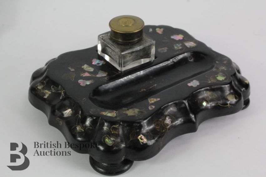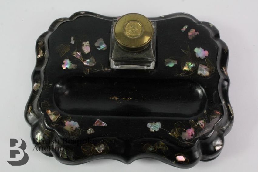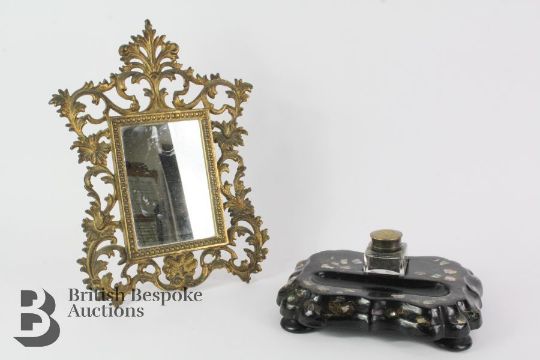 Late Victorian Papier-Mâché ink stand, decorated in the chinoiserie style heightened with abalone shell, supported on bun feet, approx 21 x 18 cms together with a brass easel mirror. approx 32 x 23 cms.