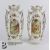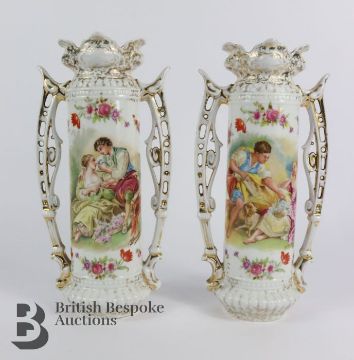Pair of porcelain pillar vases, printed with illustrations after Boucherz approx 28 cms h and a gilded cup and saucer painted with roses.