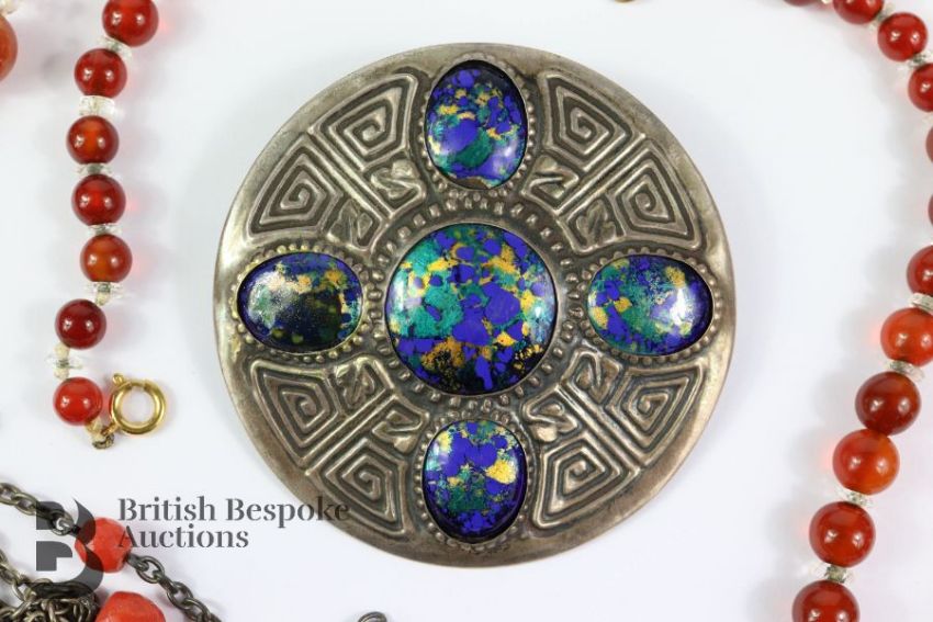 Arts and Crafts silver-fronted enamel circular brooch, 60 mm diameter; long beaded coral necklace and a fine coral bead necklace approx 39 cms in length. This lot includes two agate bead necklaces, both graduated interspersed with glass beads, approx 40 and 42 cms respectively