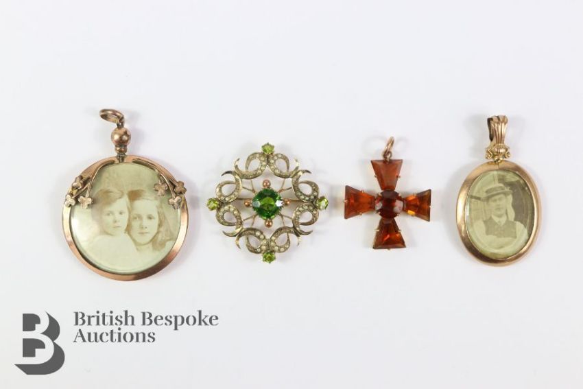 Edwardian 9ct seed pearl and peridot (centre stone is not a peridot origin unknown) pendant brooch approx 30 mm; rolled gold portrait pendant; 9ct gold locket Chester hallmark, mm GFB and a glass cross pendant.