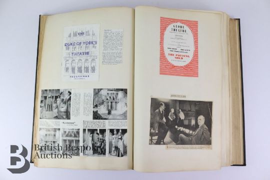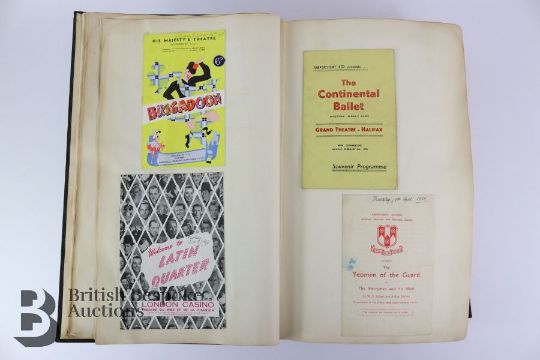 A large leather-bound scrap book containing a quantity of early 20th century theatre,ballet, symphony and jazz programs, with a number of tickets, including The Bradford Alhambra 'Sleeping Princess' 1948, Theatre Royal 'Oklahoma' 1949, Apollo Theatre 'The Happiest Days of Your Life' 1949, Empress Hall 'Festival of Ballet' 1949, London Coliseum 'Annie get your Gun', Opera House Manchester 'Swan Lake', His Majesty's Theatre 'Brigadoon', London Casino 'Welcome to the Latin Quarter', Grand Theatre Halifax 'The Continental Ballet', Royal Opera House ' Ballet Season 1950', Royal Opera House 'New York City Ballet' 1950, Theatre Royal Carousel 1950, The York Festival 'Cycle of Mystery Plays', Stadttheater Aachen, Royal Festival Hall 'International Ballet', Leeds Grand Theatre 'Graduation Ball', Wyndham's Theatre 'The Love of Four Colonels', Palace Theatre 'Zip Goes a Million', The Floral Hall - Scarborough, Halifax Playhouse 'Beauty and the Beast', Comedy Theatre 'For Better for Worse', Shakespeare King Richard III and The Merchant of Venice, The Taming of the Shrew, The Tragedy of King Lear, Theatre Royal Antony and Cleopatra, Queen's Theatre 'Present Laughter', Queen Elizabeth Hall 'Mainly Schubert', Her Majesty's Theatre 'The Teahouse of the August Moon', Royal Festival Hall 'National Jazz Federation Jazz Part 2, Piccadilly Theatre 'The Jazz Train', Theatre Royal Bath 'Seagulls over Sorrento', Theatre Royal 'The Confidential Clerk', Shakespeare Theatre 'Macbeth' 1955 with Laurence Olivier in the title role; The Opera House Manchester 'Pardon my Claws', Stoll Theatre 'Kismet', Duke of York Theatre ' The Punch Revue', Globe Theatre 'The Private Ear The Public Eye', Saville Theatre 'Pickwick', New Lyric Theatre 'Oblomov', Theatre Royal Drury Lane 'Camelot', Piccadilly Theatre 'Who's afraid of Virginia Woolf', William Shakespeare 'As you Like It' Much Ado About Nothing', amongst many others.