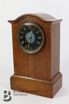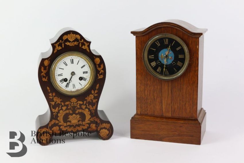 Duval A. Paris mantel clock, having a white enamel face with Roman dial, strikes to a bell, the case having decorative inlay, approx 29 h x 20 w cms, together with an oak cased mantel clock, with a Japes Freres movement, approx 30 h x 18 w cms. (2)