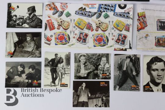 Elvis Presley collecting cards, including a number of The Wertheimer Collection, a number of The Elvis Collection, a number of The GraceLand Tour, a number of Elvis The Early Days, Elvis Aloha Special, Elvis with Celebrities, Elvis Personal Life and Army Days (250+ cards). This lot includes The Beatles mint stamps x 12.