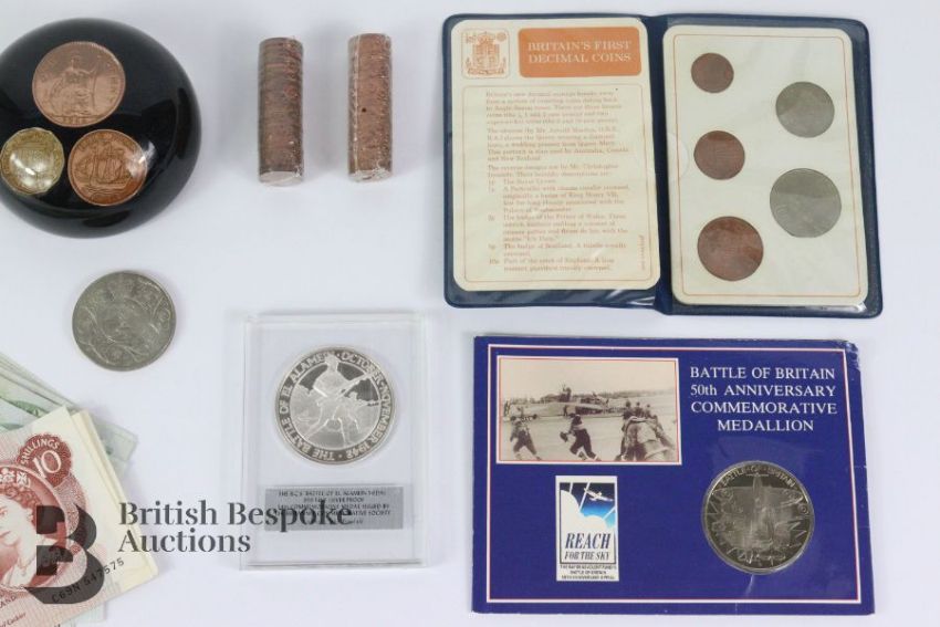 Miscellaneous coins, including a silver proof coin commemorating the B.C.S Battle of El Alamein designed by John Bergdahl and a Battle of Britain 50th Anniversary Commemorative medallion 1977 Elizabeth II commemorative crown x 2, two rolls of half penny coppers, Britain's First Decimal coins and a coin paperweight, seventeen £1 notes; four ten shilling notes.