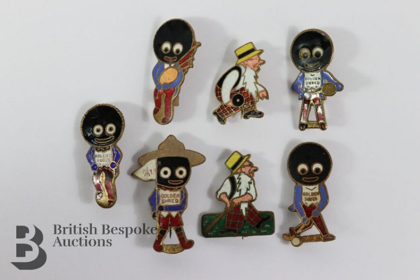 Five Golden Shred Golly badges from the 1960s including three marked Fattorini & Sons, together with two Youngs Brewery 'Father William' pin badges. (7)