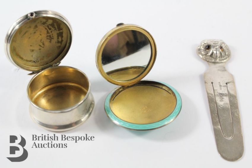 Two silver and enamel pill boxes, the first one is emerald green stamped 925 approx 4 x 4 cms and the other English hallmarks mm L & S approx 3.3 cms diameter; together with a silver book mark with owl finial London hallmark dated 1899, mm SM & Co.