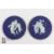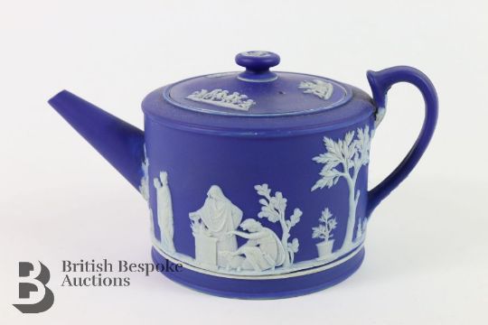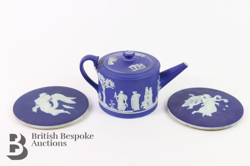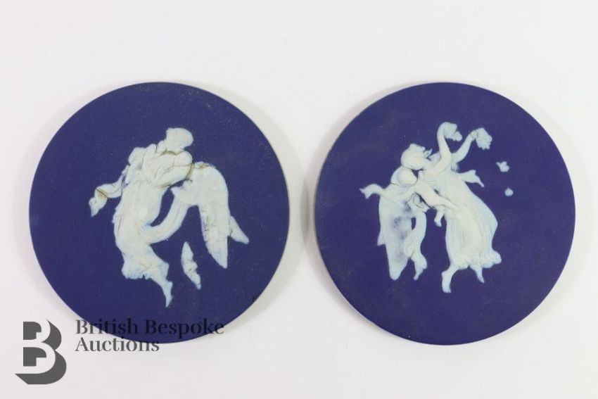 Wedgwood blue tea pot illustrated with classical frieze, together with two Wedgwood plaques, approx. d 14cms. (af)