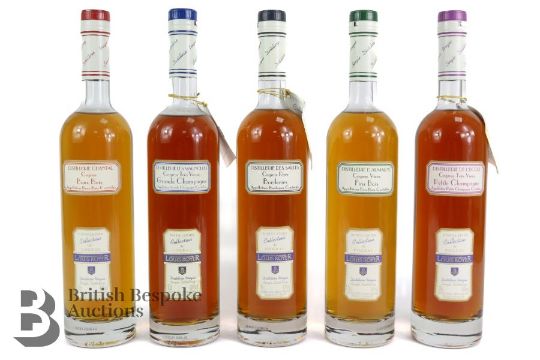 Five bottles of assorted Louis Royer Cognac, including La Magnolias Grande Champagne, de l'École Petite Champagne, D' Aumagne Fins Bois, Chantal Bons Bois and a rare des Saules Borderies, each of these bottles is sealed. (5)