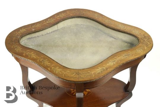 Mahogany bijouterie table, 19th century, with decorative foliate inlay to the surround with brass beading and ormulu decoration , with a lower tier, on shaped legs.