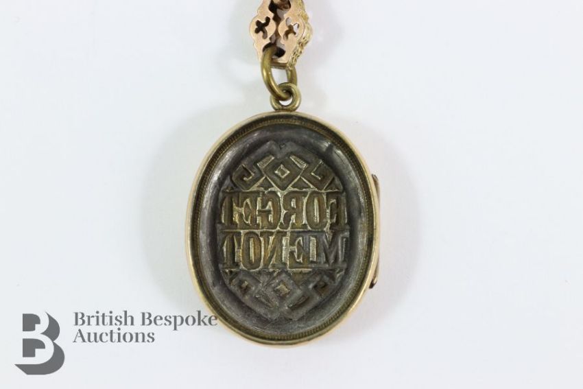 9ct gold fancy fob chain with a 9ct gold 'Forget me Not' pendant, approx. 29gms, measures approx. 34cms.