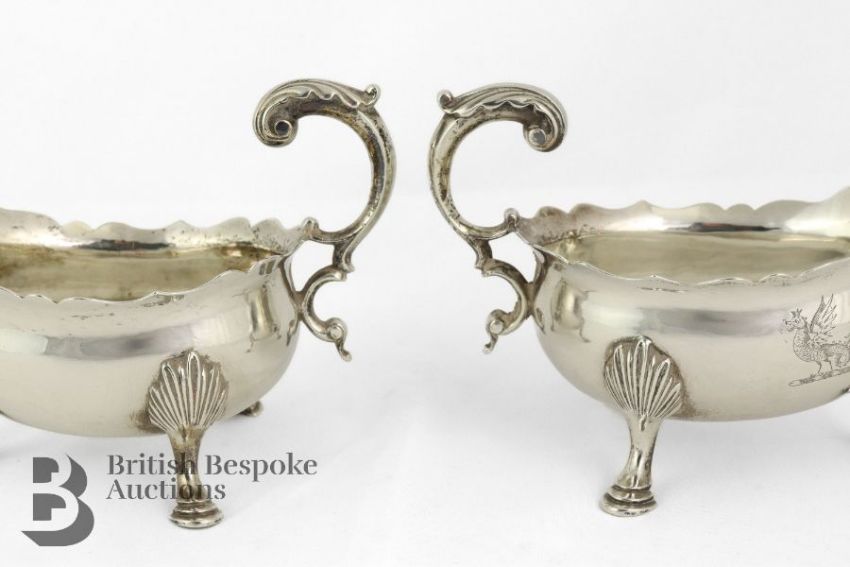 A pair of silver George III sauce boats, London hallmark, dated 1762, mm Alexander Saunders, approx 538 gms.