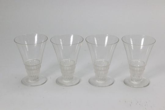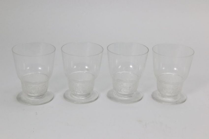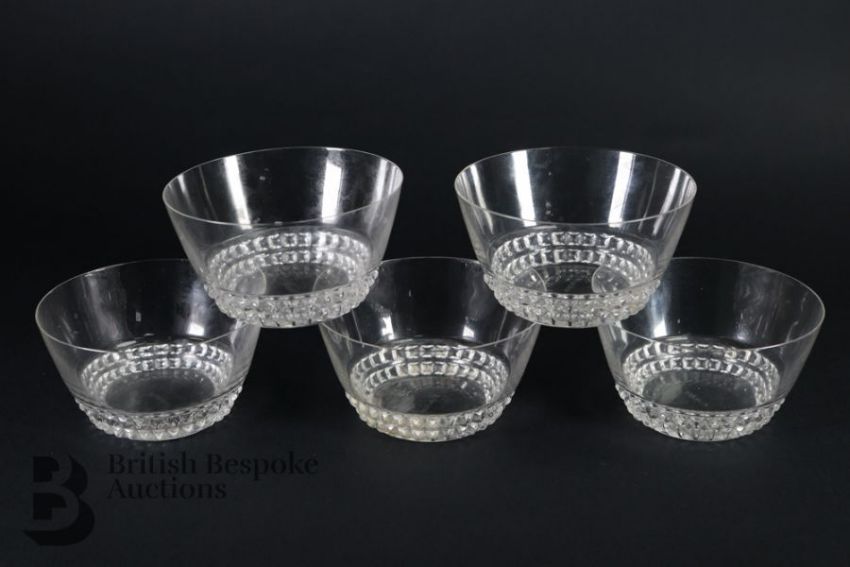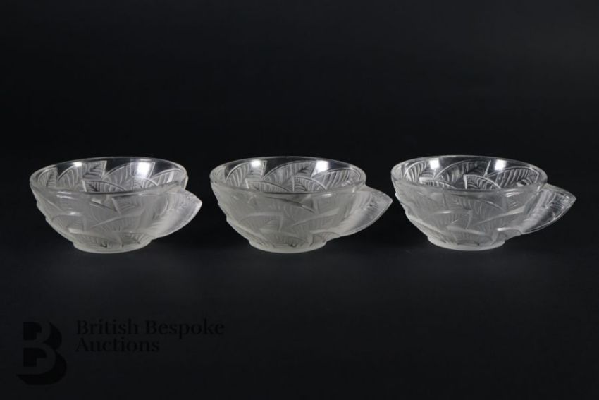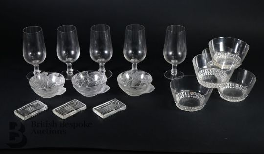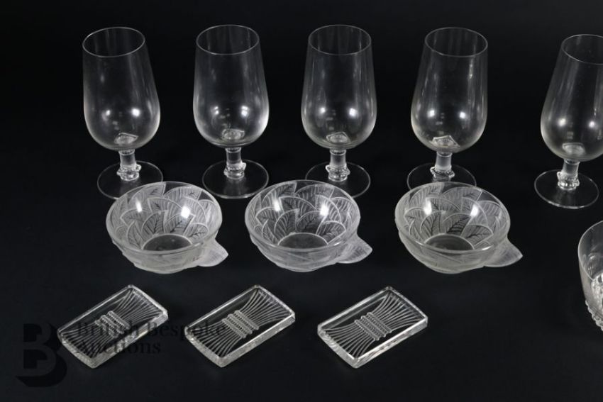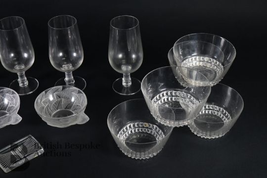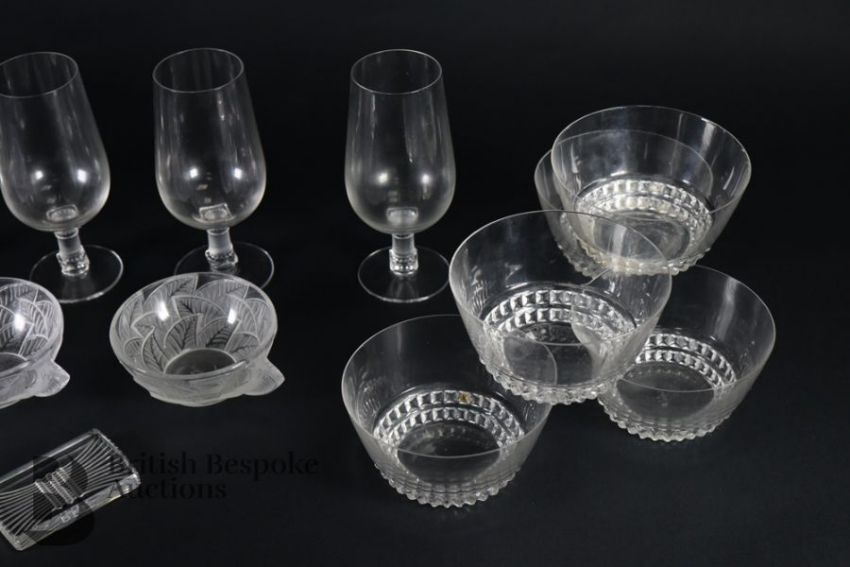 Rene Lalique glasses including six Phalsbourg pattern stemware glasses; four Lalique Bourgueil pattern glasses and four late 20th century Lalique sherbert glasses, all engraved with Lalique France. This lot continues with six Lalique ale glasses, three Lalique knife rests, three Lalique Ormeaux pattern bowls; five Lalique finger bowls.