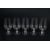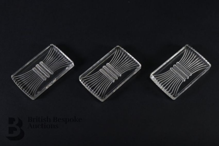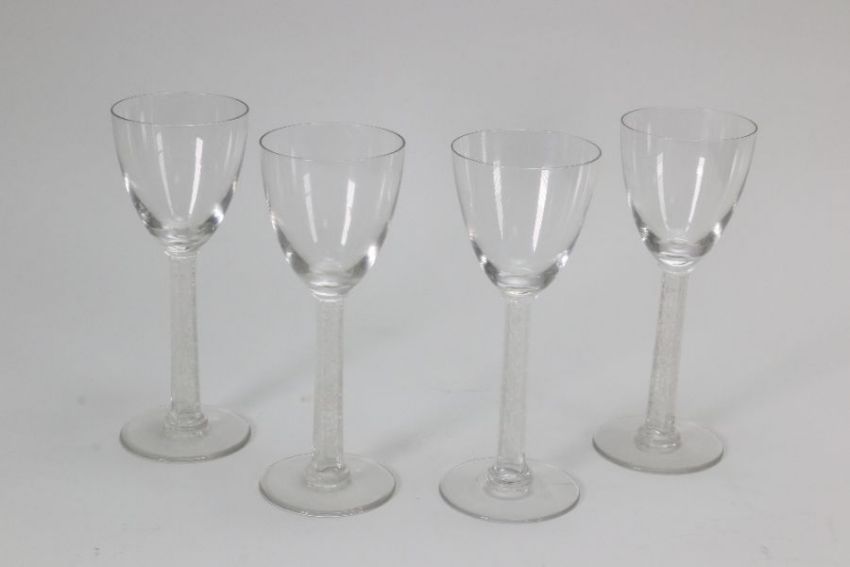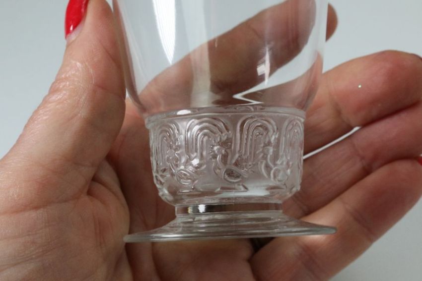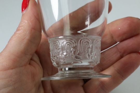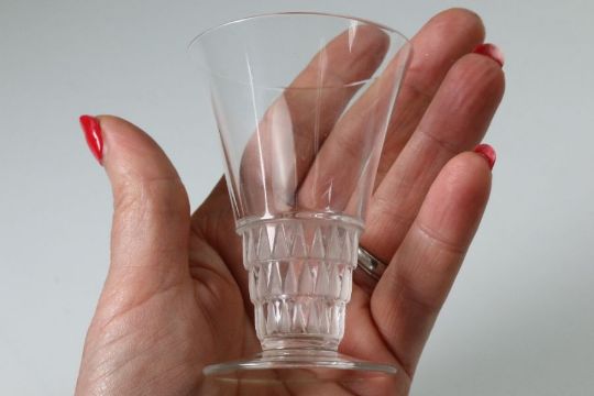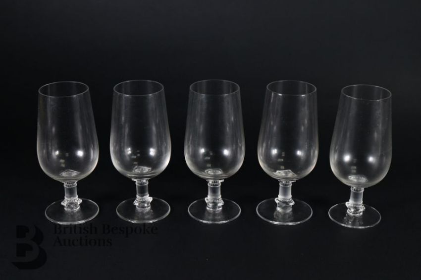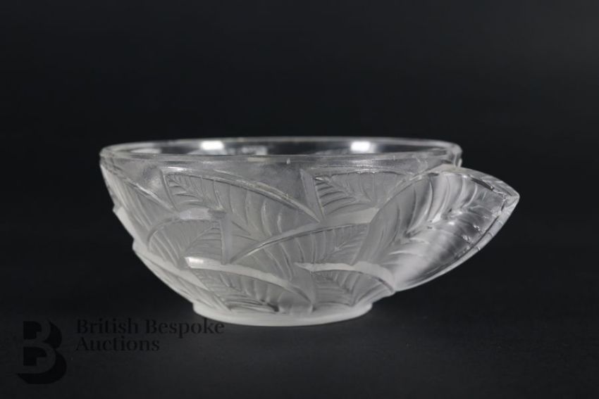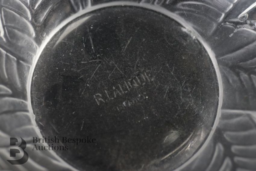 Rene Lalique glasses including six Phalsbourg pattern stemware glasses; four Lalique Bourgueil pattern glasses and four late 20th century Lalique sherbert glasses, all engraved with Lalique France. This lot continues with six Lalique ale glasses, three Lalique knife rests, three Lalique Ormeaux pattern bowls; five Lalique finger bowls.