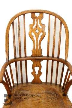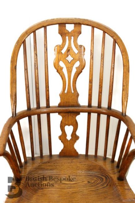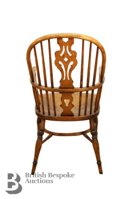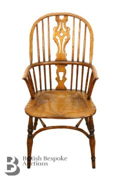 Good reproduction fireside windsor chair, spindle curved back to arm rests, turned legs and stretchers. Serial no. 15840. Measures approx. h 104 x w 52 x seat height 46cms.