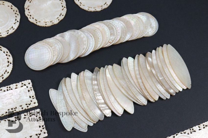 Quantity of mother of pearl counters, including 9 x 45mm circular counters; 20 x 45 x 35mm rectangular counters; 19 x 6.5 x 3mm rectangular counters; 24 x 28mm circular counters; 63 x 45mm ovoid counters and one spurious rectangular counter.