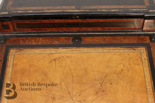Victorian ebony and burr walnut veneered davenport. The davenport having a tooled mustard leather lined writing slope that opens to reveal a burr walnut fitted interior, with a concealed gallery that opens to reveal a stationery compartment, the right side having four functional drawers, opposed by faux drawers to the left, approx 87 x 56 x 56 cms.