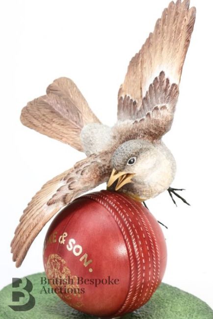 A rare limited edition 'Sparrow & Cricket Ball' figurine by Mike Tandy (ex-Royal Worcester painter). The figure is based on the sparrow that was killed by a cricket ball at Lord's on the 3rd July 1936 - the only bird that has been known to be felled by a bowler (Jahangir Khan playing for Cambridge) rather than a batsman. The actual taxidermy bird and ball are in the museum at Lord's Cricket Grounds. Together with original case and certificate.Repair where bird attaches to cricket ball.