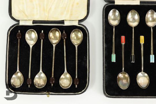 Set of silver and enamel coffee spoons, Chester hallmark, dated 1938, mm Walker & Hall, in the original presentation case; together with two sets of silver coffee-bean spoons, both Sheffield hallmark, dated 1937, mm E. Viner.