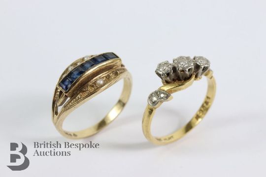 18ct yellow gold three stone diamond ring, 7 pts of dias, size L, 2.97 gms; together with a 9ct gold and sapphire ring, the ring having five channel-set midnight blue sapphire 5 x 2.5mm, approx 2.46 gms.