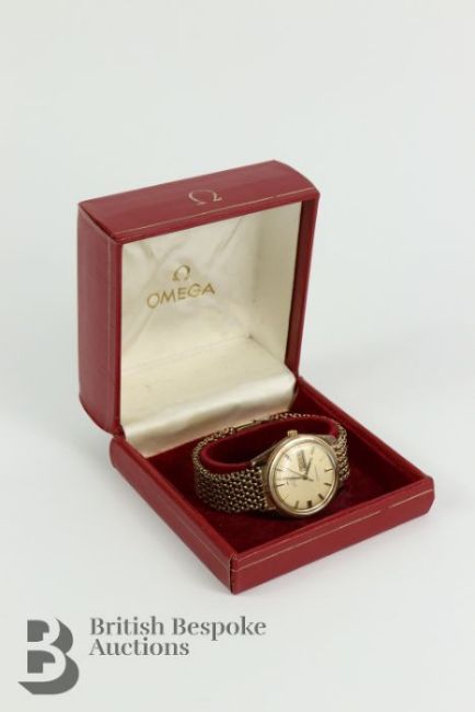 Gentleman's 9ct gold Omega Seamaster Automatic Day Date wrist watch. The watch having a 30mm champagne face with baton dial, movement nr 29466549, case nr 1665032, the watch presented on a 9ct gold mesh-link bracelet, total length including watch back is 16 cms., 70 gms (including the movement (*cr) Together with the original box.