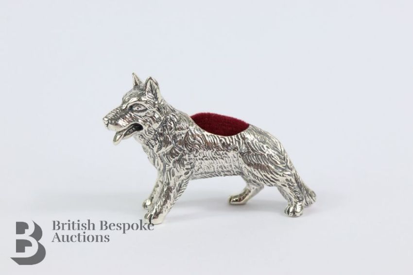 Silver pin cushion modelled as a German Shepherd, approx 50 x 30 mm.