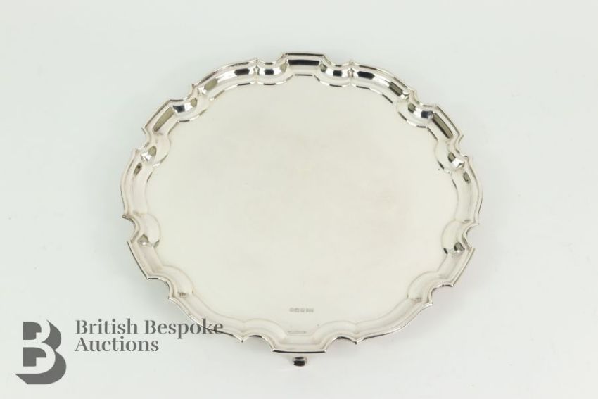 Elizabeth II silver tray, pie-crust edge on pad feet, Sheffield hallmark, dated 1957, mm Walker & Hall, approx 31 x 31 cms, approx 750 gms.