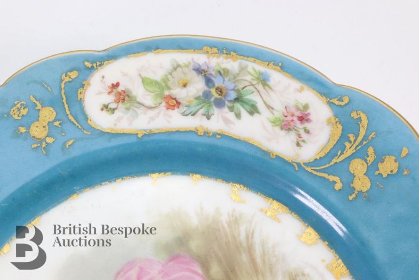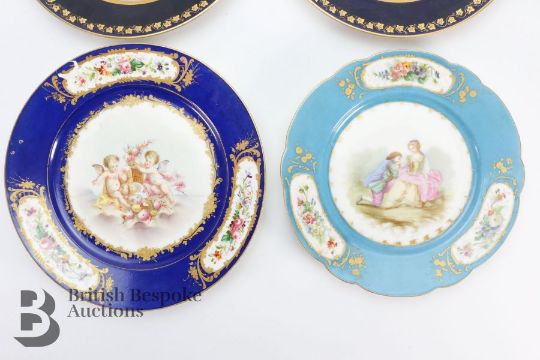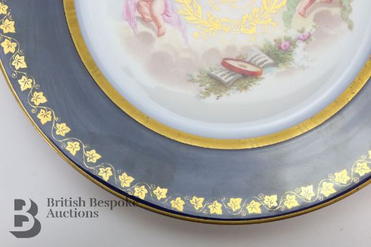 Sevres porcelain cabinet plate, circa 1781, celeste bleu border interspersed with floral reserve, the centre reserve painted with young lovers, approx 22 cms diameter; with another Sevres cabinet plate, circa 1771 having a cobalt blue border interspersed with floral reserves, the center reserve painted with cherub and floral bouquets, heightened with gilt approx 24.3 cms diameter (af) together with two Sevres Chateau des Tuileries cabinet plates, 19th century, cobalt blue border with gilded vine surrounding a painted reserve with a L cypher and musical putti approx 24 cms diameter, plus one other decorated with blue boarder and floral sprays. (5)Condition ReportThe second plate is beautiful but sadly has been subject to staple repair to verso.
