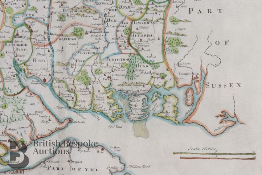 Robert Morden (1650-1703) hand coloured county map, Hampshire, inscribed with the county name and the cartographer's name within a decorative cartouche, approx 44w x 37 cms, framed and glazed.