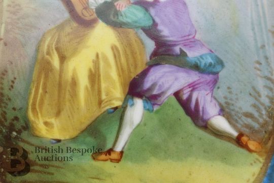 Dresden porcelain plaque, finely painted with a boy beside a stream, approx 12 x 10 cms together with another unknown porcelain plaque painted with two figures approx 14 x 18.5 cms, impressed mark to verso 180. (2)
