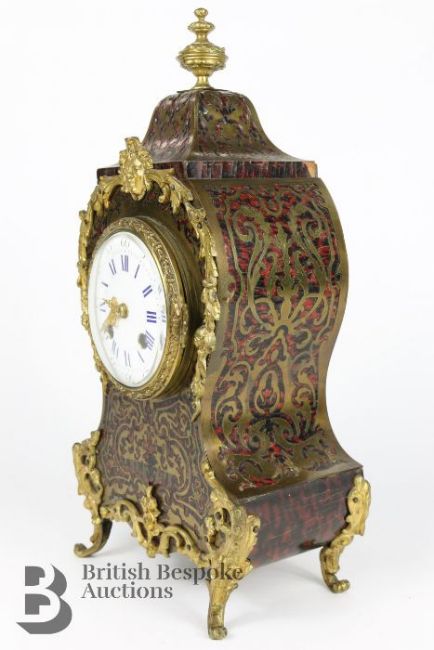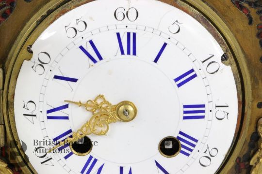French boulle clock, the waisted case surmounted by a scrolling urn mount with brackets, the clock having a white porcelain face, 90mm white enamel face with blue Roman numerals and sixty minute chapter ring and gilt hands. The clock having a brass Japy Freres movement with medal winner medallion nr 1590, approx 35 cms h, complete with pendulum and winding key.