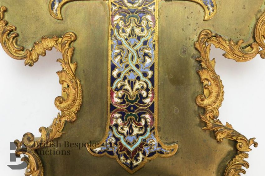 Antique gilded Roman Catholic Bénetier, a gilded brass plaque with an champleve crucifix affixed to it, beneath it is the champleve receptacle for holy water, approx 30 h x 20 w cms.