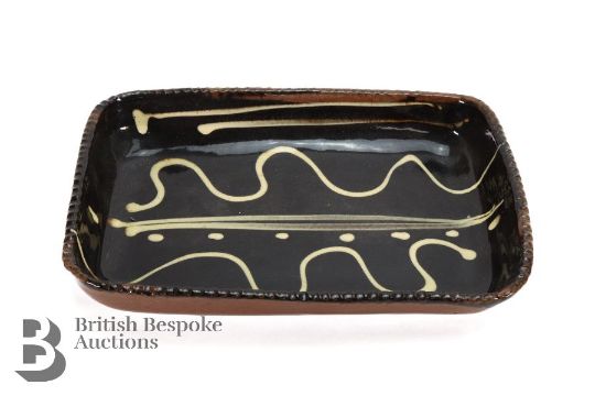 Patrick Groom (active 1947-1954) for Winchcombe Pottery, a slipware rectangular dish, brown glaze with cream trailing design, pinched edge, approx 33 x 23 cms. Note: Patrick was apprenticed to George Townsend and Raymond Finch at the tender age of 14 years and was apprenticed for seven years to the age of 21 years.