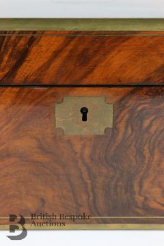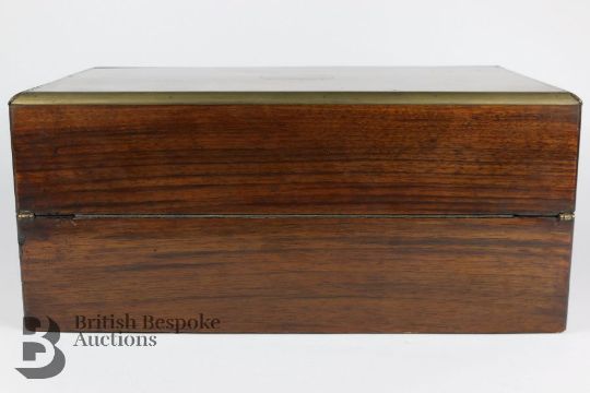 19th century mahogany and brass bound writing box. The box opens to reveal a fitted interior with black tooled writing slope, pen rest, in very good condition, approx 40 x 25 x 18 cms. The box is brass bound with a vacant cartouche, complete with key.