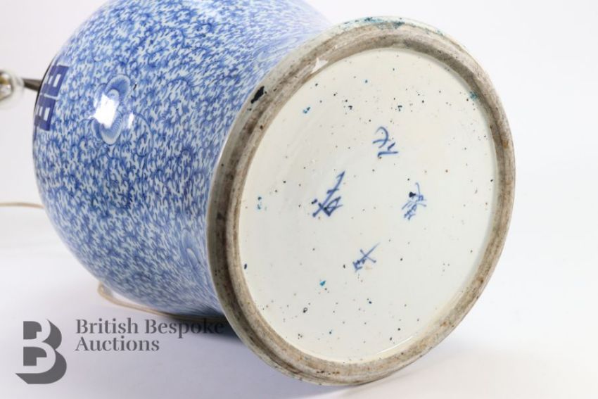 Chinese blue and white lamp base, early 20th century Republic Period, with a double happiness symbol, approx 77 cms including the brass fittings.
