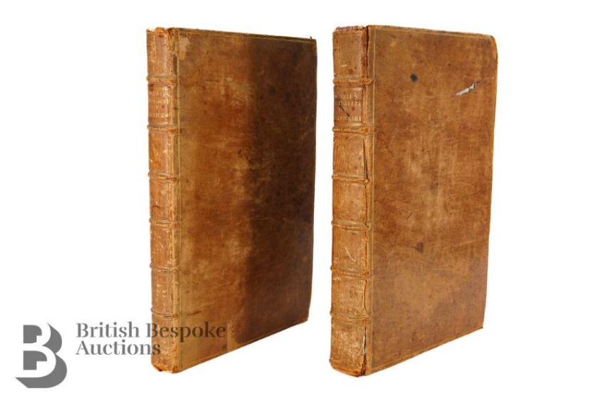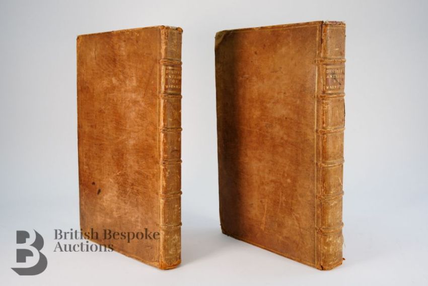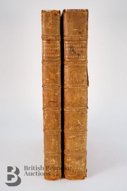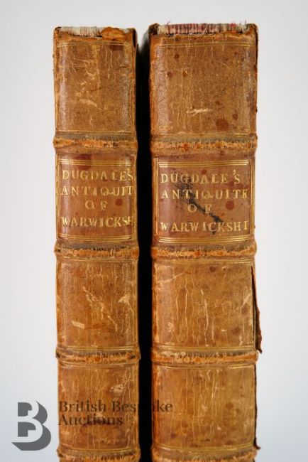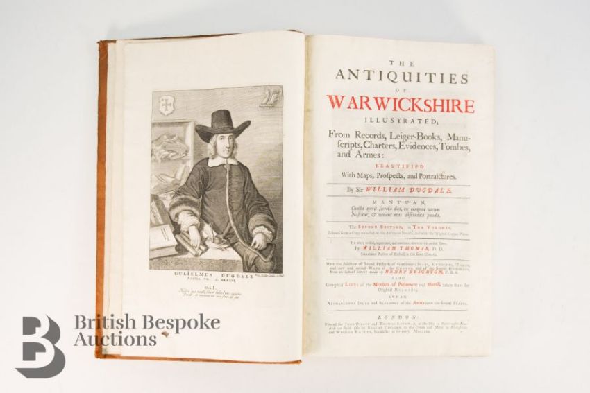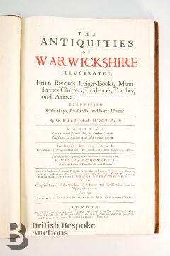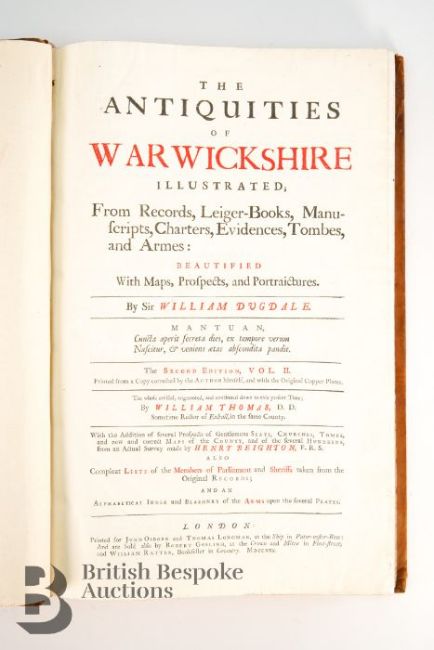 Dugdale (Sir William) & Thomas (William) revised, The Antiquities of Warwickshire Illustrated [....], two volume set, second edition, published London: John Osborn and Thomas Longham 1730, portrait frontispiece engraved by Wenceslaus Hollar, titles in red and black, five engraved maps and 19 plates by Henry Beighton, numerous engraved illustrations by Hollar and others with titles including fine prospects of gentleman's seats, arms, leather bound with gilt title to the spine.