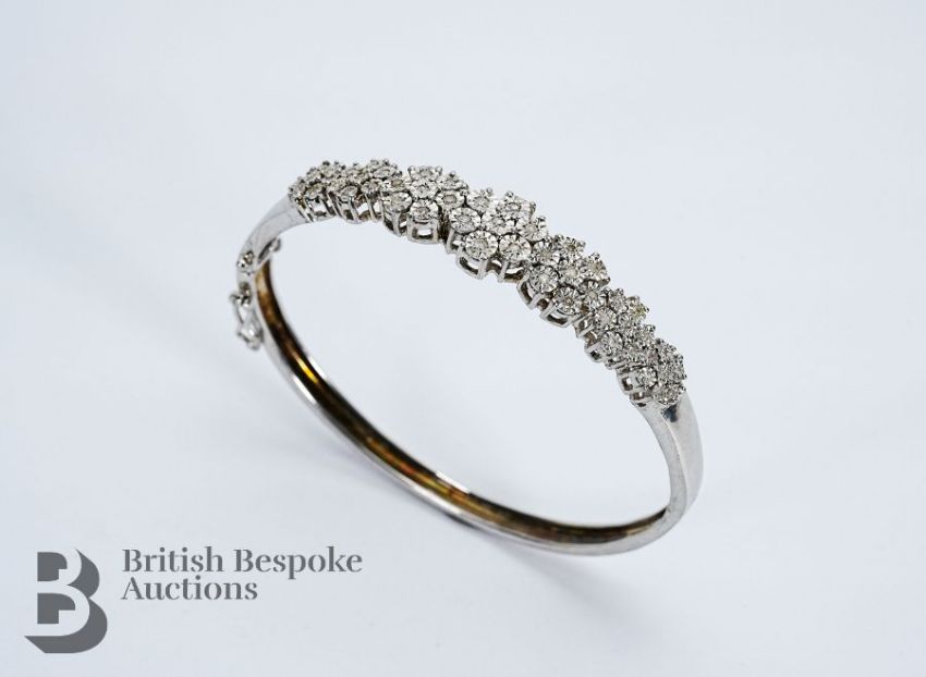 Sterling silver and diamond floral bangle. The bangle set with 46 pts of dias, together with an SGL certificate, 17.7 gms, together with a pair of paste drop earrings.