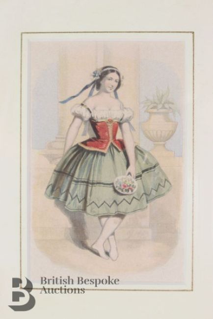 Charming set of partial colour prints, entitled Ballet Dancers I, set nr B17-1, in costume from the 1850's with daring hemlines for the period, each print approx 14.8 x 9.5 cms framed and glazed.