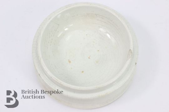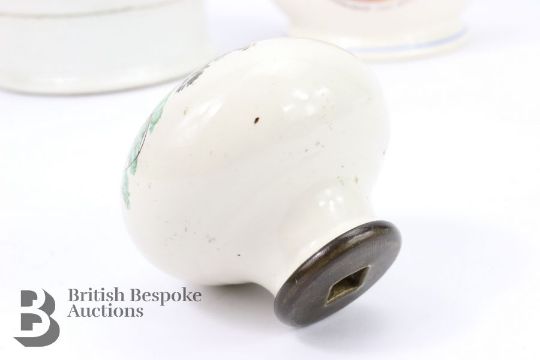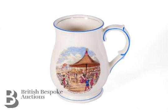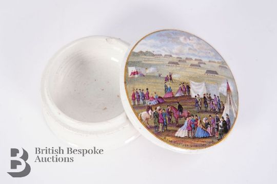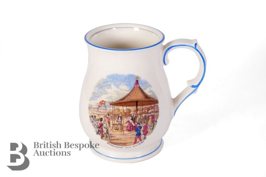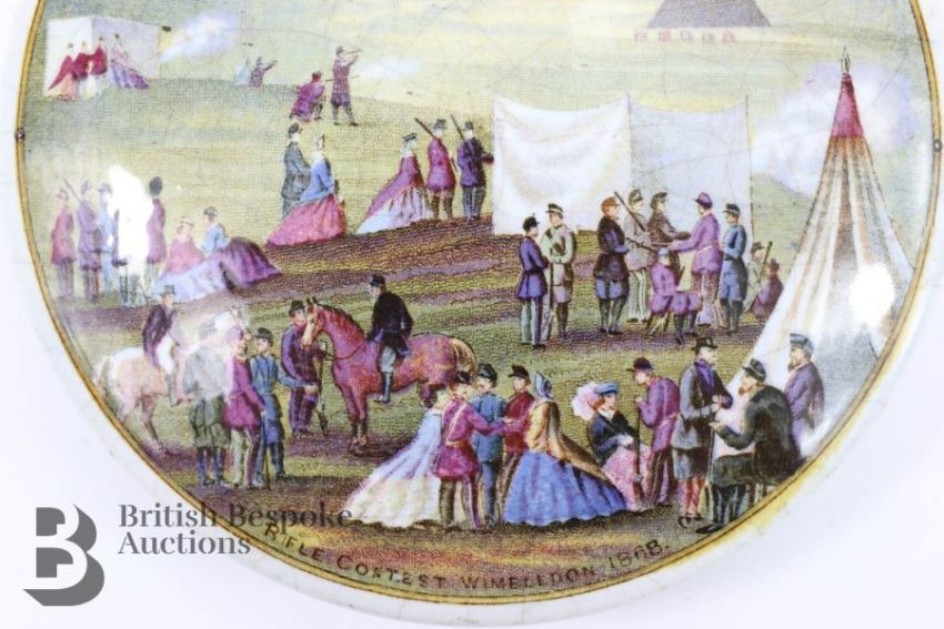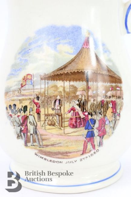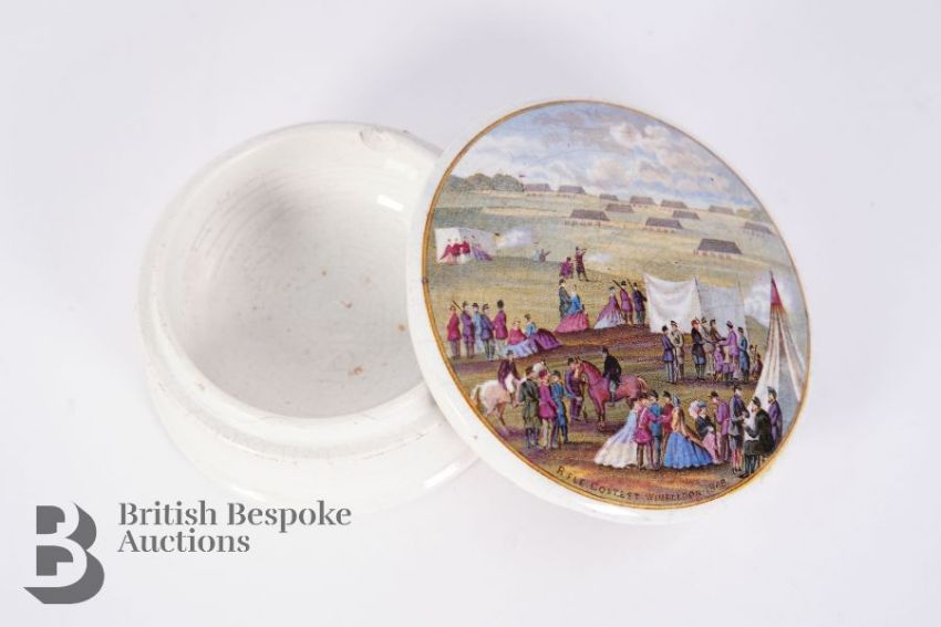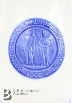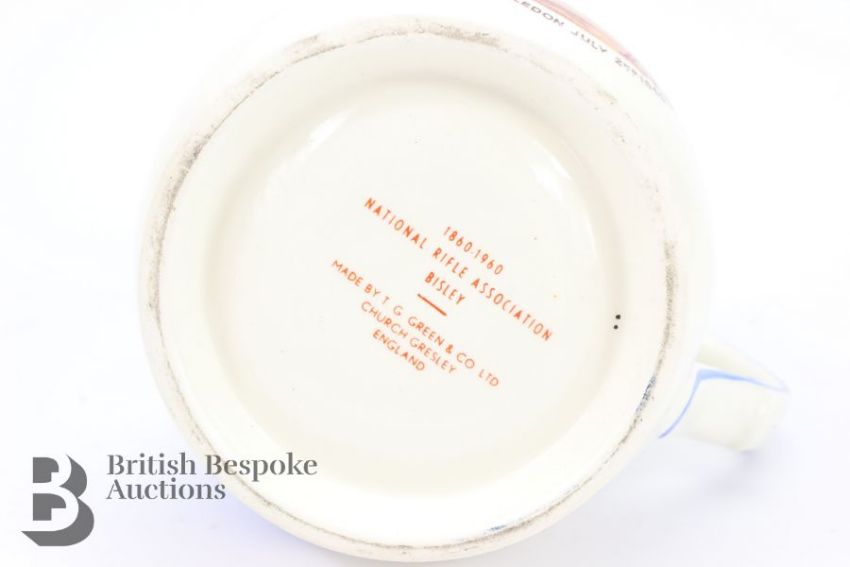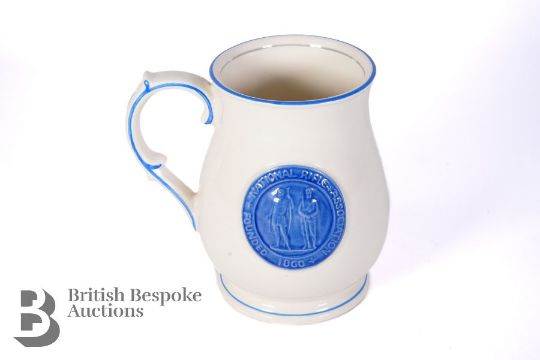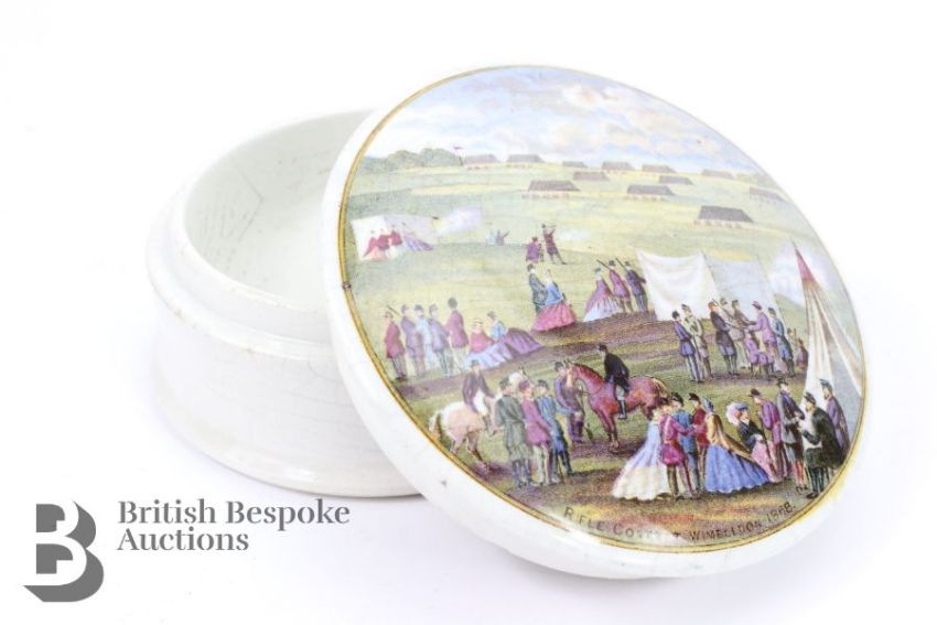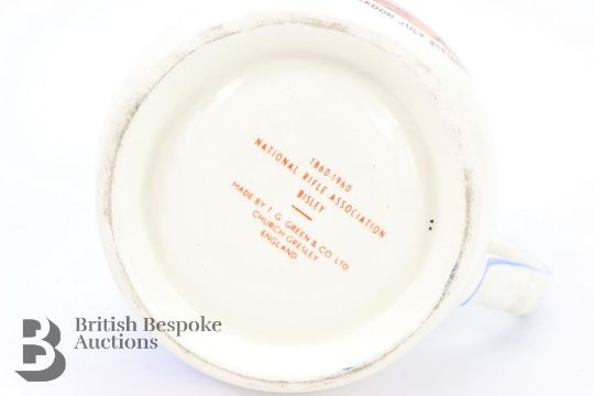 A T.G Green ceramic tankard, one side depicts the first shot taken at Wimbledon by Her Majesty Queen Victoria July 2nd 1860 officially opening the first meeting of the National Rifle Association by firing the first shot from a Whitworth rifle, whilst the opposing side depicts National Rifle Association emblem in relief, approx 13 cms h. (*cr). This lot continues with a 19th century Prattware John Burgess paste pot and cover, entitled 'Rifle Contest Wimbledon 1865' approx 11 cms diameter. (*cr)