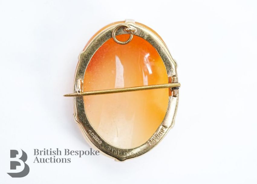 9ct gold shell cameo pendant brooch, in a filigree frame, approx 38 x 28 mm, 8 gms depicting a feminine profile, mm E.J.Cy & Co; together with another 9ct shell cameo pendant brooch, Birmingham hallmark dated 1962, approx 35 x 27mm,