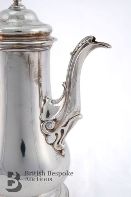 George III silver coffee pot, of traditional baluster form with hinged cover and flame finial, leaf-capped spout with scroll junction, supported on a circular foot, fruitwood scroll handle, approx 26 cms h, London hallmark dated 1760, mm Fuller White, approx 860.6 gms.