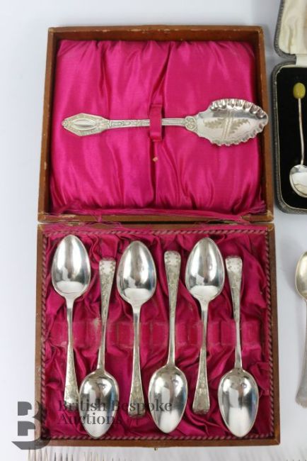 Box of the mother of pearl dessert set is broken but present and the box of the Walker & Hall fish knife and forks is broken at the hinge too.