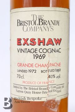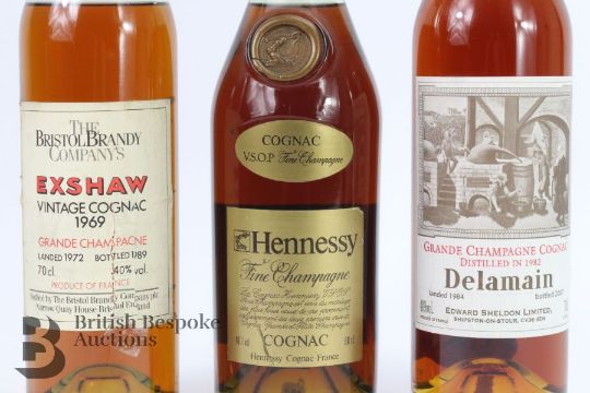 Bottle of 1970 Hennessy V.S.O.P Fine Champagne cognac, 68cl; The Bristol Brandy Company's Exshaw Vintage Cognac 1969 Grande Champagne landed 1972 bottled 1989 70cl embossed metal capsule, Delamain Grande Champagne cognac landed 1984 bottled 2007 Edward Sheldon Limited 70cl.